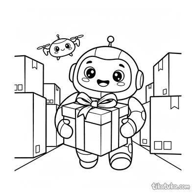 También hay escenas donde un robot gato desempaca una caja o donde un robot caja juega al escondite. Todas las ilustraciones están en blanco y negro con líneas claras, listas para imprimir. Puedes descargar las que más te gusten de una en una o imprimir varias a la vez para tener una sesión de colorear completa.