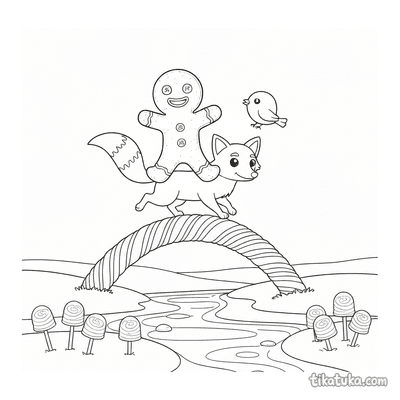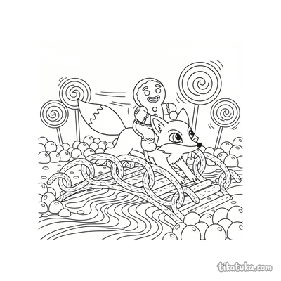 También hay escenas con el hombre de jengibre cruzando puentes de menta montado en un zorro, ofreciendo una mezcla de realismo y fantasía. Todas las ilustraciones están en blanco y negro con líneas claras, listas para imprimir en casa o en la escuela. Puedes descargar las que más te gusten de forma gratuita y colorearlas con lápices, rotuladores o directamente en la pantalla.