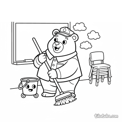 Oso conserje barriendo con una fregona amigable