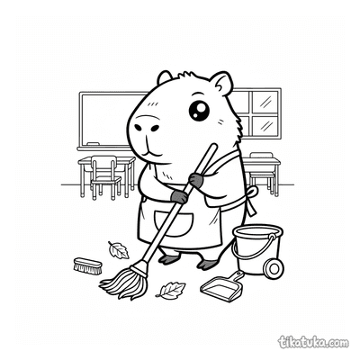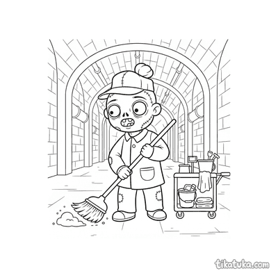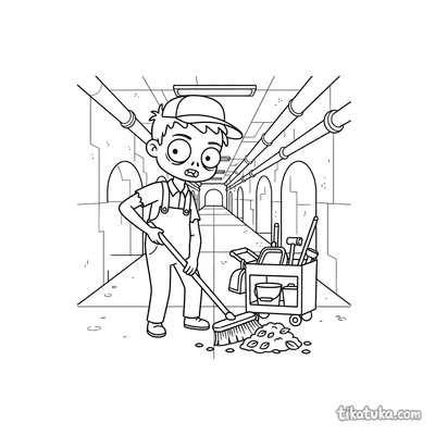 En esta sección encontrarás escenas de limpieza con personajes variados, como un robot conserje flotante barriendo un pasillo, una princesa hada ordenando una casa de champiñón o un zombi conserje empujando una escoba en una alcantarilla. También hay dibujos de una capibara con fregona, robots limpiadores esféricos y personajes como Vorticella o Cenicienta ocupados en sus tareas.