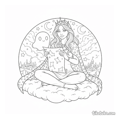 Esta colección de dibujos para colorear está dedicada a las nubes y a los personajes que las habitan. Las ilustraciones presentan escenas fantásticas que tienen lugar en el cielo. Los niños pueden explorar un mundo de imaginación sobre un fondo de nubes.