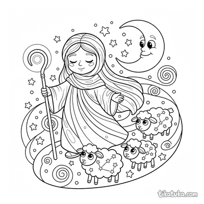 También hay mandalas celestiales que mezclan fases lunares con estrellas, y un pastor que cuida de los astros en un paisaje de fantasía. Todos los dibujos de constelaciones están en blanco y negro, con líneas claras perfectas para imprimir. Puedes descargar las páginas de una en una o en un lote para tener horas de diversión coloreando estos viajes estelares.