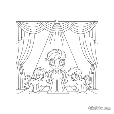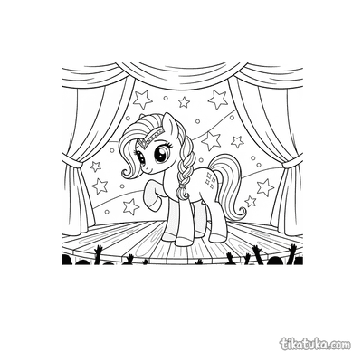 En estas páginas, la cortina es el elemento central de la acción. Podrás colorear a una niña escondida tras una cortina festiva, a un potro asomándose tímidamente o a un poni saludando en el final de una función. También hay dibujos de una campanilla en una caja de ventana o de un pegaso tramoyista ayudando con el telón, ofreciendo una visión mágica del mundo tras bambalinas.