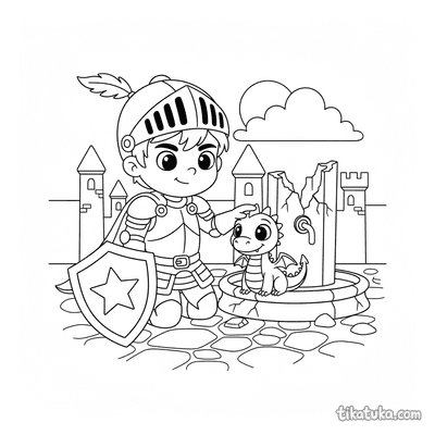 También hay escenas con caballeros, como un joven caballero acariciando a un dragón bebé o un niño volando una cometa con forma de dragón. Todas las ilustraciones están en blanco y negro, con líneas claras que son perfectas para que los niños den vida a estas criaturas fantásticas con sus colores. Puedes descargar e imprimir cualquiera de los 77 dibujos de forma gratuita, ideal para una tarde de creatividad o para imprimir varios y hacer tu propio álbum de dragones.