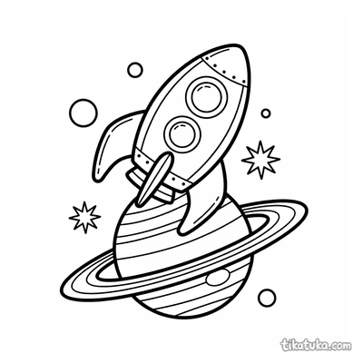 Cohete retro con aletas orbitando gigante gaseoso anillado