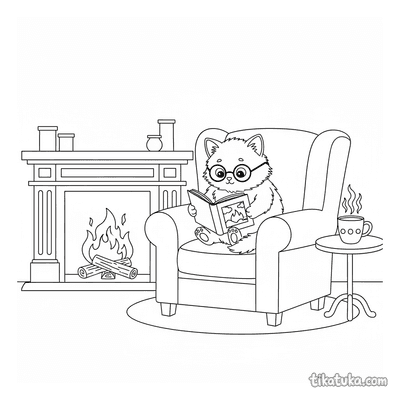 Gatito Leyendo Libro junto a Chimenea