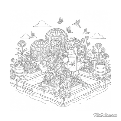 También hay escenas imaginativas, como monstruos cuidando jardines de hongos brillantes o ciudades jardín flotantes con monorraíles futuristas. Puedes descargar e imprimir gratis todas las ilustraciones, ideales para proyectos escolares o tardes de manualidades. Los dibujos tienen líneas claras y bien definidas, perfectas para colorear con lápices, rotuladores o incluso de forma digital.