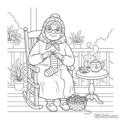 Abuela tejiendo en el porche