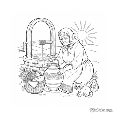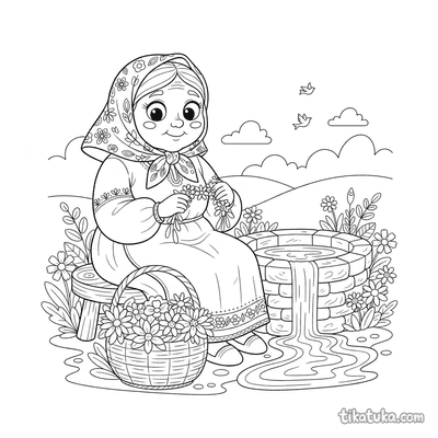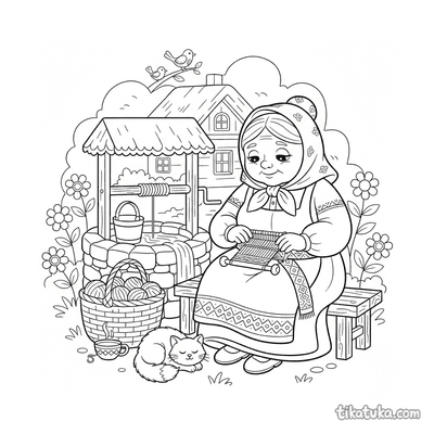 Abuela Tejiendo una Guirnalda junto al Pozo