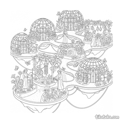 Esta colección de dibujos para colorear presenta diferentes escenas con invernaderos. Los diseños incluyen estructuras de cristal llenas de plantas y entornos mágicos relacionados con la jardinería.