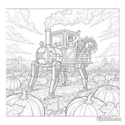 Encontrarás escenas con tractores de vapor vintage trabajando en el campo, a veces cargados con remolques de calabazas. También hay dibujos de niños participando en una feria de la cosecha, desfilando con espantapájaros o vistiendo trajes folclóricos, junto con músicos de pueblo y familias de animales, como conejos cosechando zanahorias.