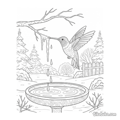 Colibrí curioso flotando cerca de un carámbano en un jardín de invierno