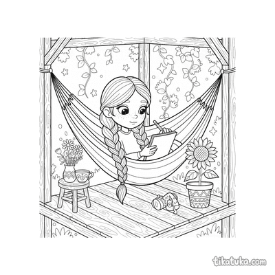 Niña dibujando en diario en la hamaca del porche