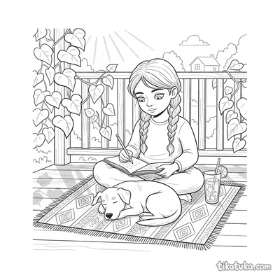 Niña dibujando en su diario en el porche