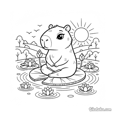 También hay capibaras y carpinchos en postura de meditación, usando el loto como un islote flotante al atardecer. Todas las ilustraciones están en blanco y negro con líneas claras, listas para imprimir en casa o en la escuela. Puedes descargar las 15 láminas de loto de una vez o colorearlas directamente en la pantalla si prefieres.