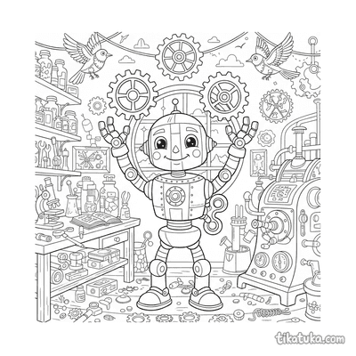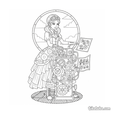 Encontrarás a un inventor steampunk trabajando en su taller, a un caballero puliendo un escudo de engranajes y a una princesa en una torre de relojería. También hay robots haciendo malabares con piezas, búhos mecánicos bibliotecarios y zepelines a vapor surcando el cielo. Cada dibujo está lleno de detalles de maquinaria para descubrir mientras coloreas. Puedes descargar e imprimir todas estas páginas de una vez para tener un cuaderno de aventuras mecánicas. Los trazos en blanco y negro están bien definidos, lo que facilita colorear los intrincados diseños de engranajes y las complejas piezas de cada máquina.