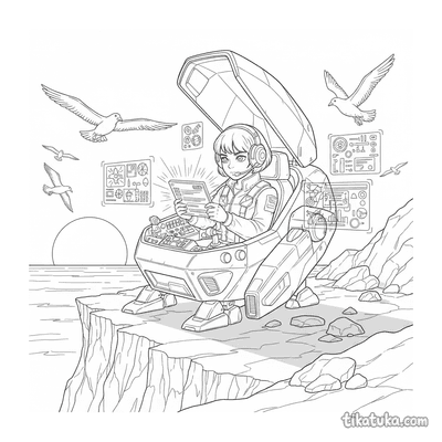 Piloto de Mecha en Cabina Haciendo Diagnósticos en Acantilado