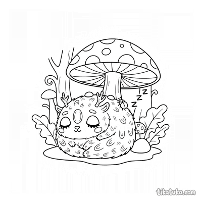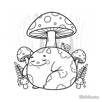 También hay monstruos de musgo amigables durmiendo bajo setas gigantes y búhos pequeños en ramas al anochecer. Las escenas combinan la textura del musgo con la vida del bosque y personajes fantásticos. Puedes descargar e imprimir todas estas páginas en blanco y negro para colorear con lápices o rotuladores. Los trazos claros y los detalles definidos hacen que sea fácil dar color a cada elemento del dibujo, desde las escamas del musgo hasta el pelaje de los animales.