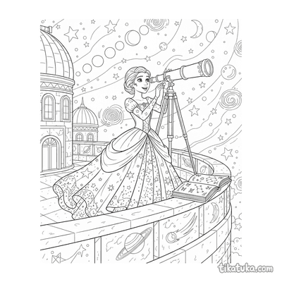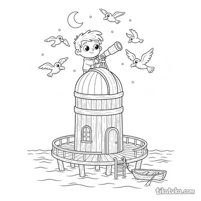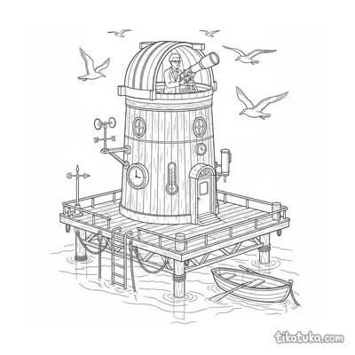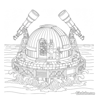 También hay diseños retro-futuristas con coches cohete y vestidos de gala decorados con constelaciones, todo ambientado en torno a la arquitectura del observatorio. Puedes descargar gratis las 15 láminas en blanco y negro para imprimir. Los trazos claros y los fondos sin relleno facilitan que los niños coloreen cada detalle de estas escenas astronómicas y marinas.