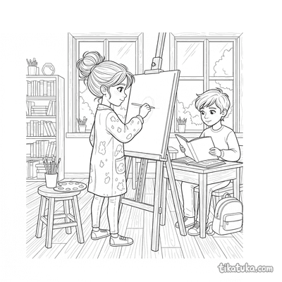 Esta colección reúne páginas para colorear sobre Dibujando. Los dibujos muestran escenas creativas donde los personajes están inmersos en la actividad de pintar y dibujar.