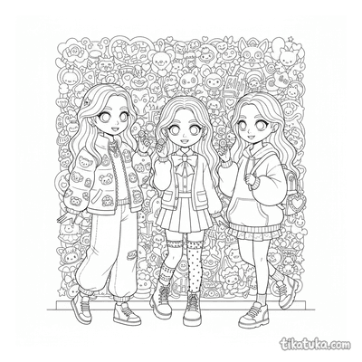 Trío de moda callejera kawaii en pared de grafiti