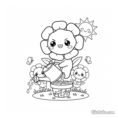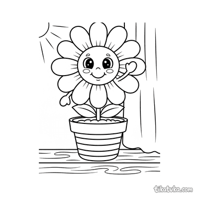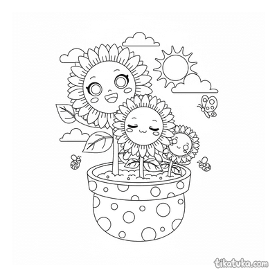 También hay diseños de flores en macetas, como un ramo de peonías en un jarrón de cerámica o una familia chibi de girasoles. Todas las ilustraciones están en blanco y negro con líneas claras, listas para imprimir en casa o en la escuela. Puedes descargar las que más te gusten y colorearlas con lápices, rotuladores o incluso probar diferentes combinaciones de colores directamente en la pantalla.