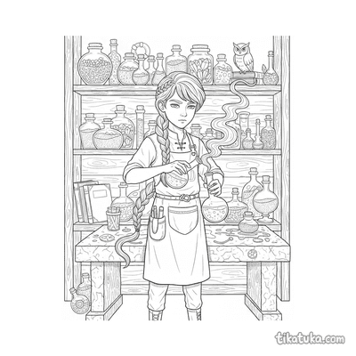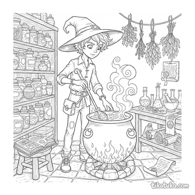 Esta colección de dibujos para colorear está dedicada al fascinante mundo de las pociones. Las ilustraciones muestran escenas de alquimia y magia, con personajes creando mezclas especiales. Los niños encontrarán calderos, ingredientes misteriosos y aprendices en sus talleres.