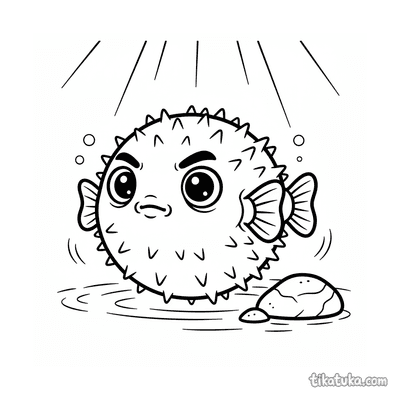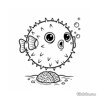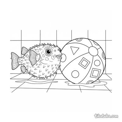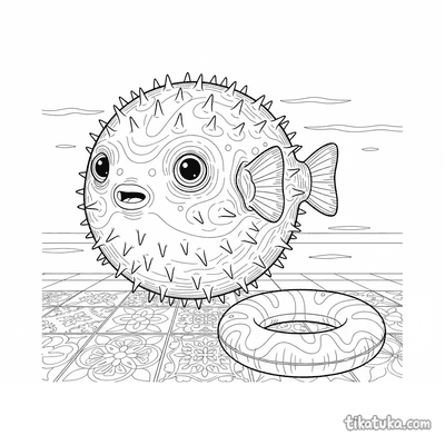 En esta colección encontrarás escenas específicas de peces globo, como uno inflándose cerca del coral o entre guijarros, otro cerca de un aro de piscina en los azulejos, y algunos en el lecho de pasto marino o en la arena. También hay dibujos con elementos juguetones, como un pez globo junto a una pelota de playa inflable en la piscina, o mostrando una expresión sorprendida.