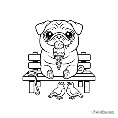 Pug con helado en banco