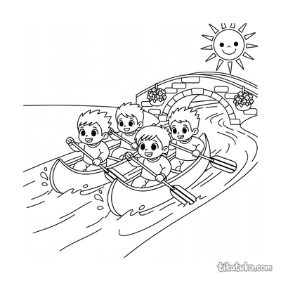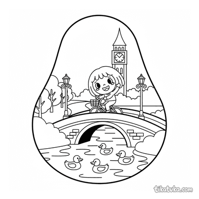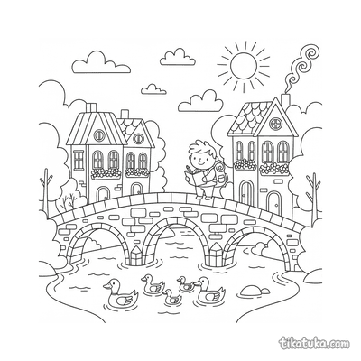 Verás paisajes con puentes de piedra cruzando el cauce, niños jugando en la orilla construyendo torres de piedras, y aviones vintage sobrevolando colinas junto al agua. También hay escenas imaginativas con personajes, como el hombre de jengibre navegando en botes hechos de cuchara o canela.