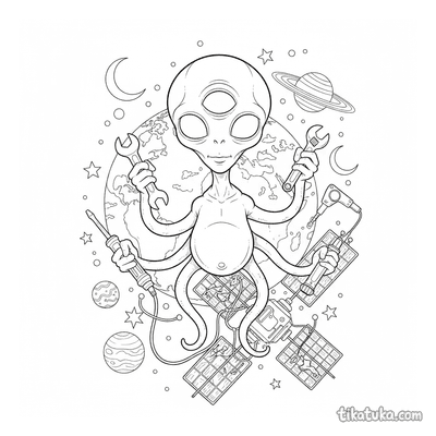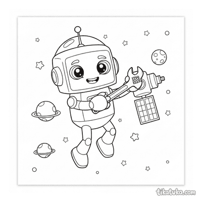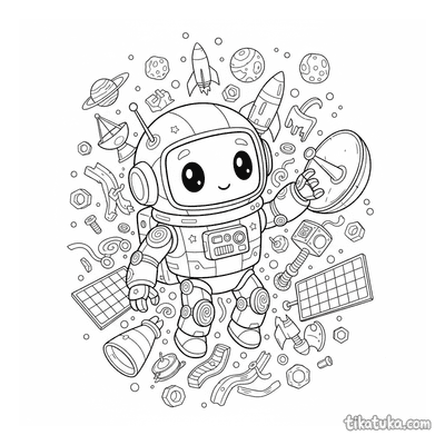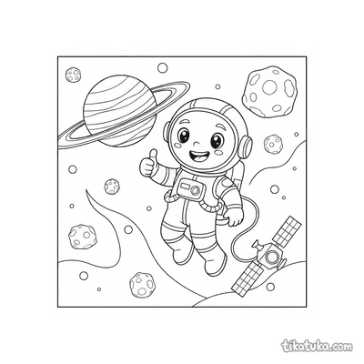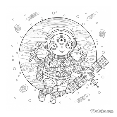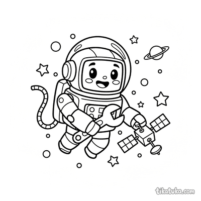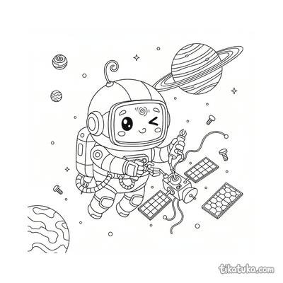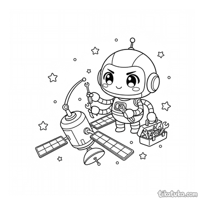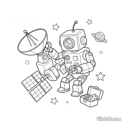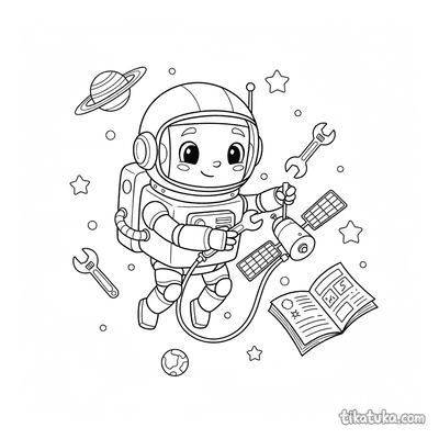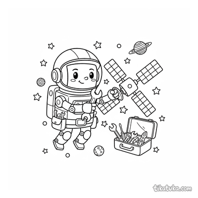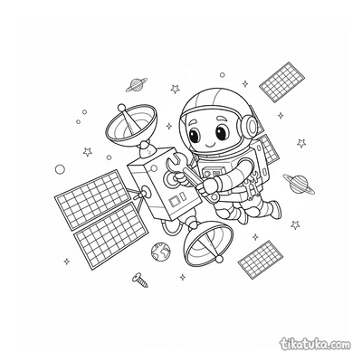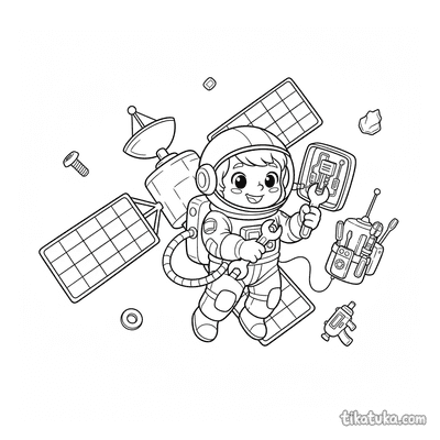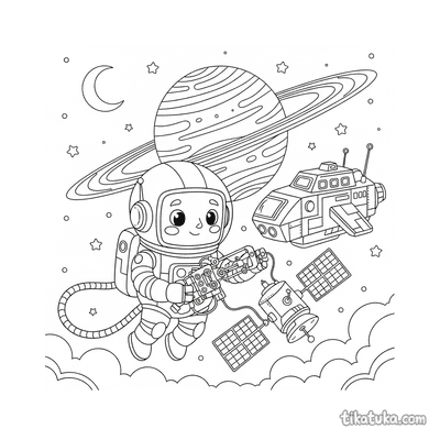 En esta sección encontrarás escenas de satélites orbitando planetas, algunos con grandes paneles solares desplegados. También hay dibujos donde astronautas y robots espaciales realizan tareas de mantenimiento o reparación en estos aparatos, incluso en lugares como un cementerio espacial. Todas las páginas están en blanco y negro, listas para imprimir. Puedes descargar las que prefieras de una en una o imprimir varias a la vez si quieres tener un conjunto completo de aventuras espaciales para colorear.