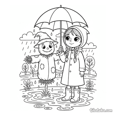 En esta sección encontrarás espantapájaros en un campo de girasoles, junto a tractores antiguos, con paraguas bajo la lluvia o acompañando a una niña. También hay dibujos con calabazas gigantes, abejas volando y animales curiosos como palomas inspeccionando a estos guardianes del huerto. Todas las ilustraciones tienen líneas claras y están listas para imprimir en blanco y negro. Puedes descargar las que más te gusten de una en una o imprimir varias páginas a la vez para tener horas de actividad creativa.