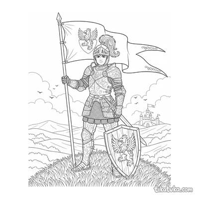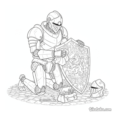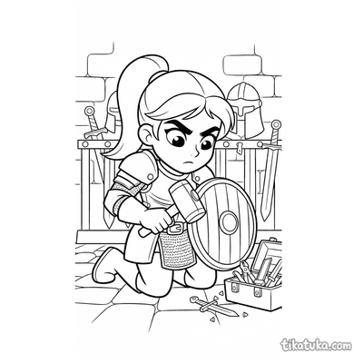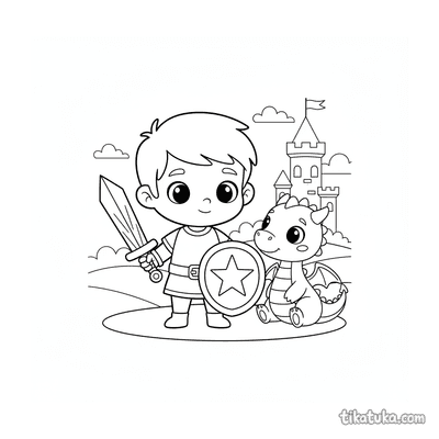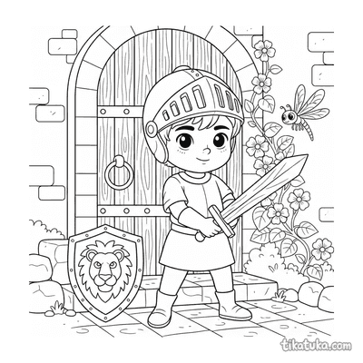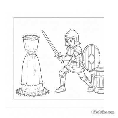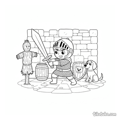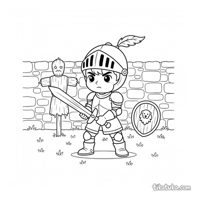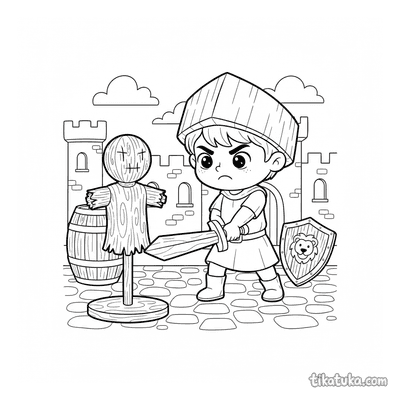 También hay escudos acompañando a dragones bebé y en escenas de práctica con espadas de madera o muñecos de paja. Todas las ilustraciones tienen líneas claras y están en blanco y negro, ideales para que los niños puedan concentrarse en colorear sin distracciones. Puedes descargar las páginas de una en una o imprimir varias a la vez si quieres organizar una sesión de colorear temática sobre caballeros y sus emblemas.