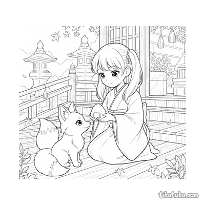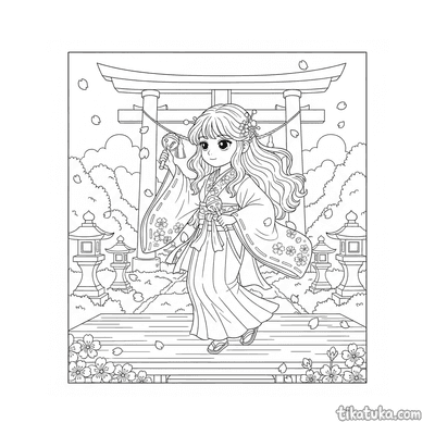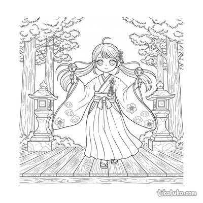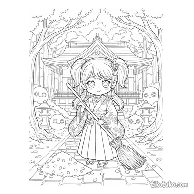 Las páginas incluyen escenas como una sacerdotisa practicando la danza Kagura con campanillas bajo un torii al amanecer, niños llevando linternas en un paseo familiar hacia el santuario, o una sacerdotisa alimentando a un kitsune al anochecer. También hay motivos de limpieza y cuidado del lugar, con personajes barriendo junto a kodamas o limpiando las estructuras sagradas.