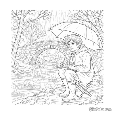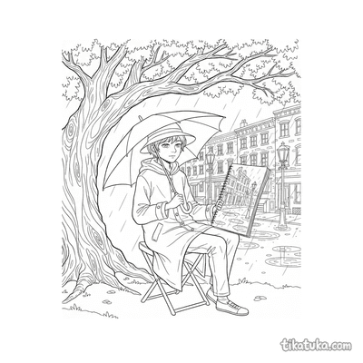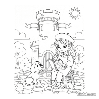 En estas escenas, los artistas y niños capturan su entorno en sus cuadernos. Puedes ver a una niña dibujando diseños de decoración en el salón, a un zorro bosquejando palomas en un banco, o a un adolescente dibujando la vista desde un porche. También hay artistas dibujando paisajes y arquitecturas, como un hombre frente a un castillo o una niña con bocetos de decoraciones.
