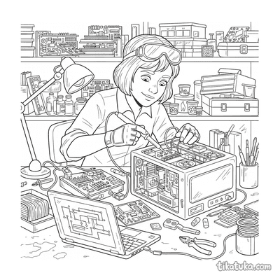 Esta colección de dibujos para colorear se centra en el mundo de la soldadura. Las ilustraciones muestran a personajes trabajando con herramientas y componentes electrónicos. Cada página presenta escenas detalladas en blanco y negro.