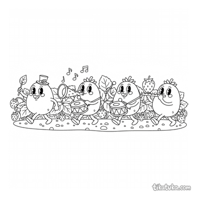También hay escenas de producción, bandas musicales y juegos donde las fresas son las protagonistas. Puedes descargar e imprimir todas estas ilustraciones en blanco y negro, con líneas claras ideales para que los niños coloreen. Es una colección amplia para imprimir en casa y disfrutar de muchas horas de actividad creativa.