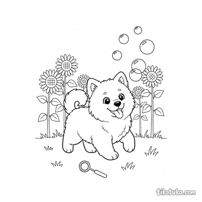 Cachorro de Samoyedo esponjoso persiguiendo burbujas