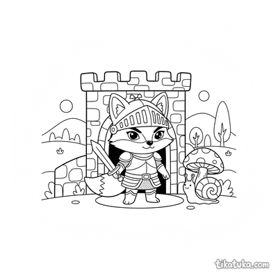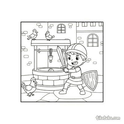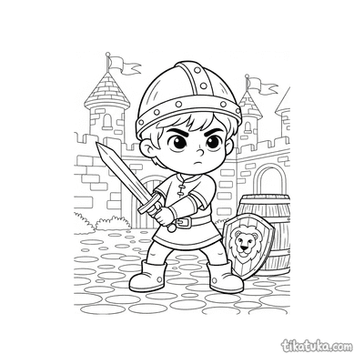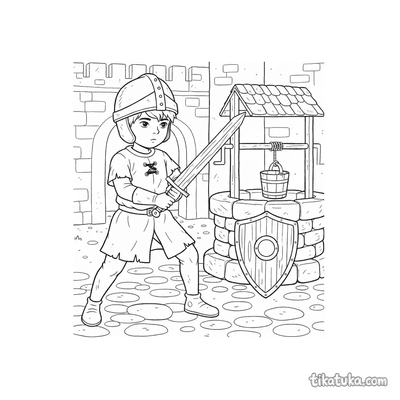 También hay escenas de caballeros junto a pozos y en las puertas de fortalezas, siempre con su espada como elemento central. Todas las ilustraciones tienen líneas claras en blanco y negro, ideales para que los niños definan sus propios colores y detalles. Puedes descargar las páginas de una en una o imprimir varias a la vez para tener horas de diversión creativa.