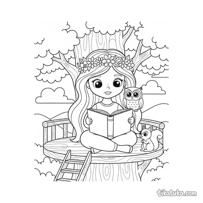 En estas páginas, la casa del árbol es el escenario para observar las estrellas con un telescopio, construir una pajarera o simplemente leer un libro. También es el hogar de personajes como un búho bibliotecario, un mapache travieso o una princesa hada horneando pasteles. Los dibujos presentan líneas claras y escenas detalladas, ideales para que los pequeños artistas se concentren en rellenar cada rincón del refugio y sus divertidos habitantes. Puedes descargar todas las ilustraciones de una vez para imprimir en casa, obteniendo páginas con trazos nítidos perfectos para lápices de colores o ceras, y también está la opción de colorearlas directamente en la pantalla.