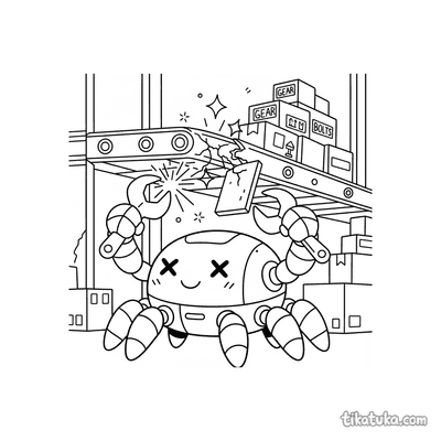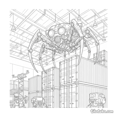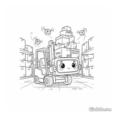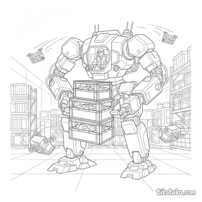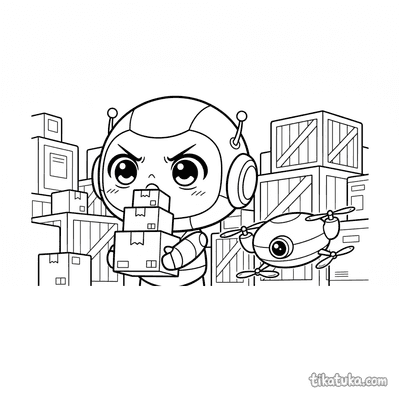 También hay ayudantes desempacando cajas, mecánicos de drones y conserjes flotantes limpiando pasillos, junto a mascotas de peluche ordenando herramientas. Todas las ilustraciones tienen líneas claras y son perfectas para descargar e imprimir en lote, ideales para proyectos escolares o tardes de manualidades. Puedes colorear online o imprimirlas gratis, disfrutando de escenas de almacén con muchos detalles y personajes mecánicos.