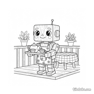 Robot de madera sirviendo té en el porche