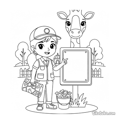 Joven guardián del zoológico en el cartel de la jirafa